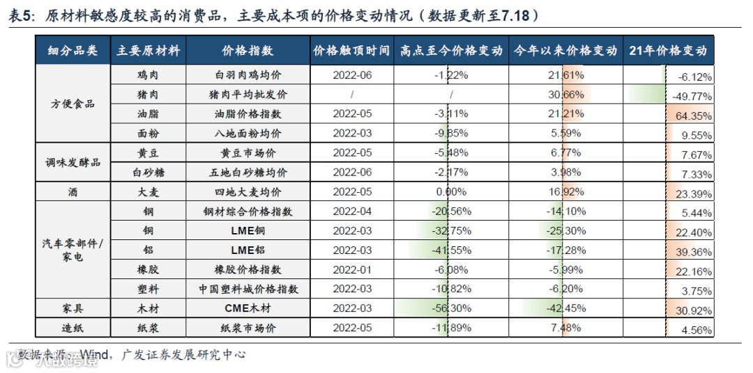 其中,可于成本敏感度较高的消费行业,寻找主要敞口原材料价格下降最显著的方向,或更快对应到利润率的修复——家电/食品/汽车零部件/家具。以主要敞口原材料去年涨幅较高、今年高点后降幅较快来观测,后续可能较快迎来利润率改善的品种为(1)金属、塑料等敞口项较大的家电、汽车零部件、家具。其中,家电在成本缓和叠加内部控费之下,净利率于22Q1已实现企稳改善,为四者中确定性相对最高的品种。(2)农产品敞口项较大的食品。5、6月以来,各类农产品价格纷纷触顶回落,后续亦将使得休闲食品、调味品等成本压力边际缓和。
