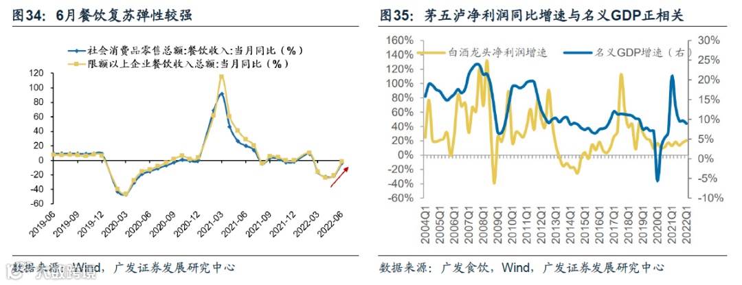 需求端来看,随着经济修复带来的餐饮及社交场景复苏形成驱动。一方面, 6 月餐饮复苏弹性较大。社零餐饮收入分项同比增速录得-4.0%,降幅显著收窄,环比抬升17.1pct。由此,使得餐饮供应链的食品(冷冻食品/复合调味品/卤制品/预制菜)的需求弹性抬升;另一方面,随着经济的修复,政商、餐聚等社交场景有望复苏,并带动需求的改善。历史来看,高端白酒的盈利与名义GDP呈显著正相关,有望受益于疫后修复。