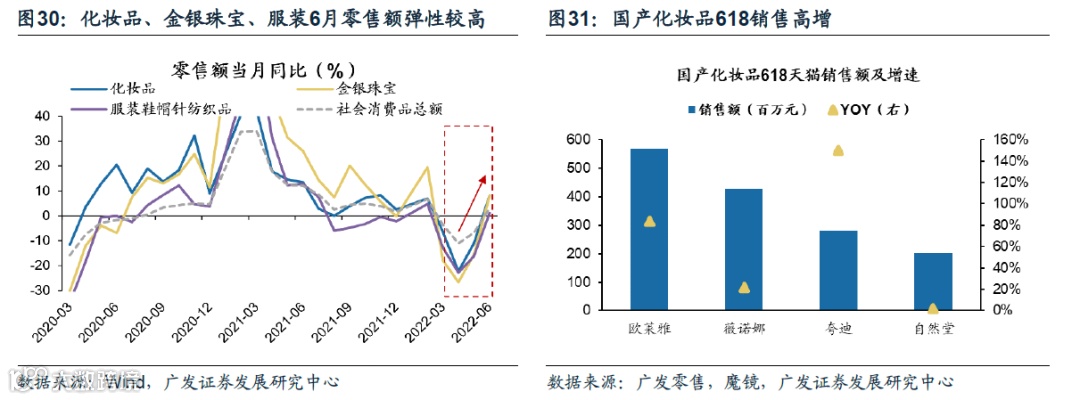 供给端来看,国潮品类的产品力、品牌力持续增强,叠加渠道拓展、创新,将对品类阿尔法形成驱动。首先,品牌打造持续推进。例如,化妆品来看,拥有核心大单品、高性价比的头部国货品牌品牌力具有滚雪球效应,市场份额持续提升。据广发零售《竞争格局优化,头部国货品牌机遇凸显》,本次618期间头部国货品牌销售增速优于绝大部分中高端国际品牌。其次,渠道革新形成加持。例如,金银珠宝龙头于线下渠道扩张,同时持续着力拓展线上渠道、捕获私域流量为线下引流。如周大生推出“云店+会员+终端门店”全渠道全场景闭环购物生态,利用线下消费线上化、线上发券引流线下等形式推动销售。