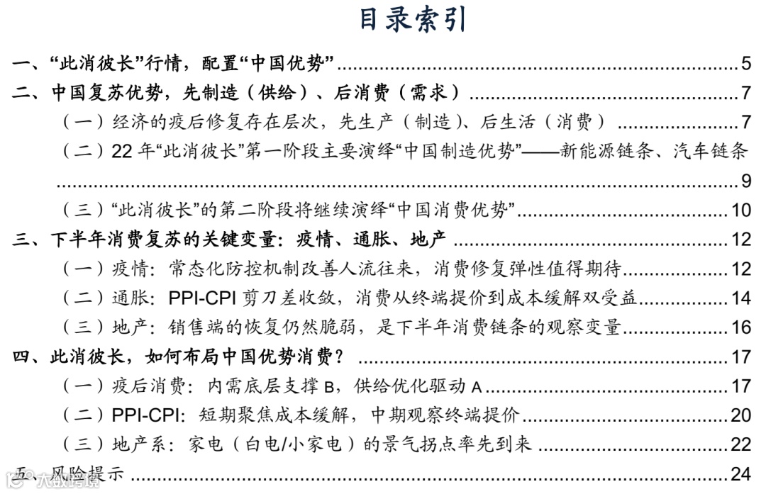 1. 疫后消费:内需底层支撑β,供给优化驱动α;居民补偿消费+品牌渠道优化—国潮(化妆品/黄金珠宝/体育服装/免税);需求端刚性稳健+供给端集中度提升—医药(眼科口腔/医美/CXO/创新药);餐饮&社交复苏+渗透率抬升—食品饮料(餐饮供应链/白酒)。2. 22年CPI通胀交易已经率先在农业(畜禽养殖)行业体现,随着下半年CPI-PPI剪刀差继续收敛,根据成本敞口与传导能力,消费行情将继续沿着“成本缓解”(家电/食品/汽车零部件/家具)与“终端提价”(家电/零售)两条线索展开。3. 地产系消费:虽然地产销售仍是下半年观察变量,但家电(白电/小家电)景气拐点已于一季报率先出现,并在中报业绩披露继续占优(白电75%预喜率)。