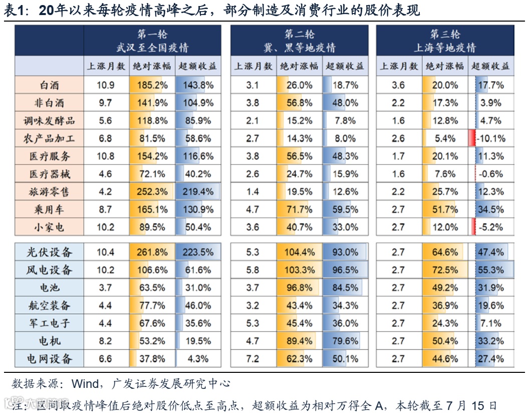 因此,经济中制造和消费的结构性修复领域,也构成了每一轮“疫后修复”下市场阶段性配置线索。参考20年1月起蔓延的武汉疫情、20年12月起蔓延的河北黑龙江疫情,以2轮疫情峰值后涨幅前20的二级行业为例,在3-6个月的维度内,占优行业集中在消费与制造行业,主要包括:必需消费(白酒/非白酒/调味发酵品/农产品加工/医疗服务/医疗器械)、可选及服务业(旅游零售/乘用车/小家电)、科技制造(光伏/风电/电池/航空设备/军工电子/电机/电网设备)。