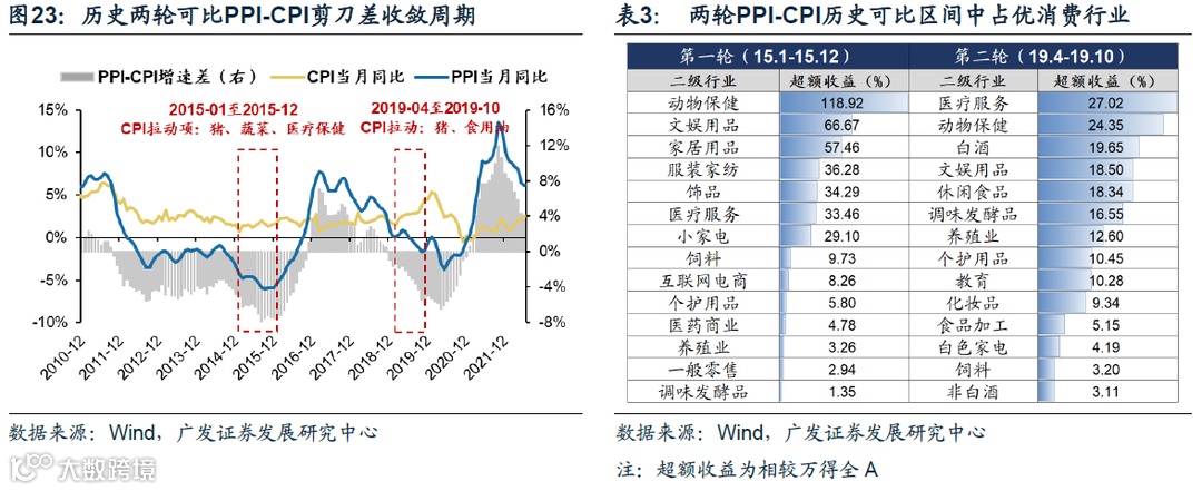 从本轮PPI-CPI剪刀差收敛的成因来看,下半年的通胀走势将与15年、19年的通胀周期较为相似(猪价上涨而核心CPI稳定、PPI回落、剪刀差收敛)。在这样的组合下,成本缓和有助于消费制造业利润率修复(家电/食品/服装),终端提价则有助于价格敏感性行业盈利抬升(农业/医疗服务/零售),消费板块迎来区间收益。据广发宏观《通胀走势仍在市场预期框架内》判断,下半年CPI仍将上行,高点可能会在3%附近或略高,猪肉价格基数影响下10月形成顶部,但核心通胀压力仍然不大。因此,参考历史并以①PPI下行;②食品项驱动CPI上行;③核心CPI稳定;④油价下行或稳定;⑤PPI-CPI剪刀差收敛来锚定今年下半年的可比区间,类似当前的历史时期主要为2015年1月-12月、2019年4月-10月。这两轮结构性的通胀周期来看,消费品行业均会迎来超额收益行情,主要集中在农业(养殖业/饲料/动物保健)、食品(调味品/休闲食品)、医药(医疗服务)、可选消费及服务业(家电/文娱用品/个护用品/零售)。