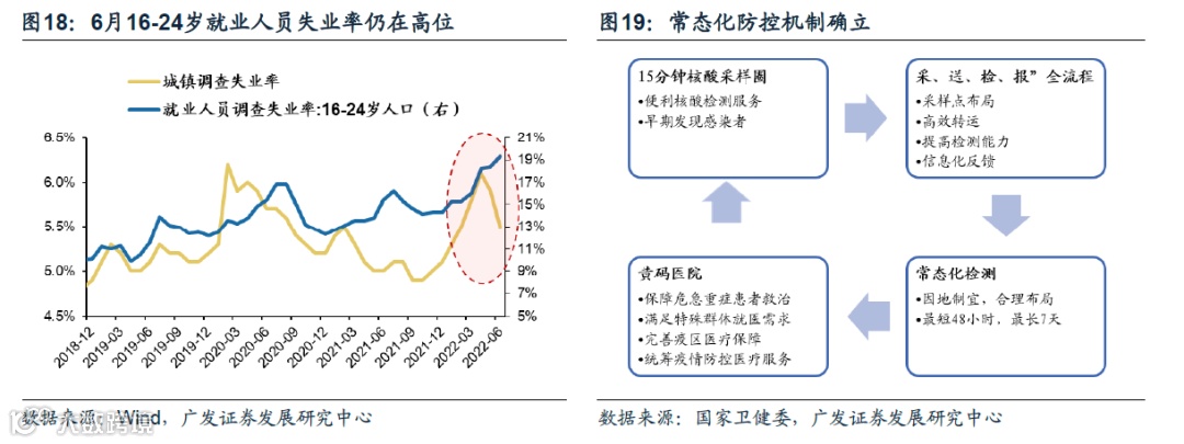 6月的城镇调查失业率数据得到改善、但16-24岁的失业率数据仍有压力,下半年稳就业稳增长依然摆在重要位置。自4.29政治局会议明确“动态清零”和“稳增长”之间协调统一的辩证关系之后,我们认为未来在常态化防疫机制的支持下,消费领域的修复斜率大概率不会破坏。近期全国的防疫政策更强调精准防疫,意在恢复正常的生产生活秩序。例如5月31日文旅部将跨省旅游“熔断”机制范围从省级调整到县级;6月5日,国务院联防联控机制新闻发布会明确提出疫情防控“九不准”,要求进一步提高防控措施的科学性、精准性、针对性,坚决防止简单化、一刀切和层层加码等现象;6月27日《新型冠状病毒肺炎防控方案(第九版)》正式发布,根据疫情的形势变化和病毒的特点,优化调整风险人员的隔离管理期限和方式,统一封管控区和中高风险区划定标准等,坚持常态化精准防控和局部应急处置相结合。
