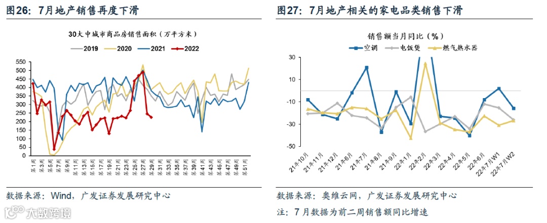 若近期监管层进一步出台 “停贷”事件的处置政策,则能够缓和市场的担忧及观望情绪。22年地产供需端“销售→融资→拿地→开工→投资”的梗阻依然需要疏通,地产销售的恢复情况是下半年消费链条的重要观察变量。7月13日多地“停贷”事件发酵,14日银保监会即做出回应“引导金融机构市场化参与风险处置”;7月17日银保监会有关部门负责人接受采访时再度表示“加强与住建部、人民银行等部门协同配合,坚持‘房住不炒’,...支持地方更加有力地推进‘保交楼、保民生、保稳定’工作”,我们认为在有关监管部门的积极表态下,“停贷”事件负向螺旋演绎的风险有限。