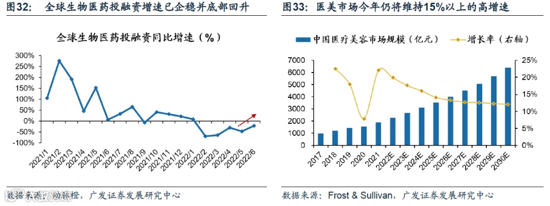 需求端来看,医药需求刚性较强,随疫情缓和有望快速修复。医疗消费来看,国内的眼科、口腔、长期医美项目等医疗消费,具有需求刚性的特质。疫情之下,多数择期需求仅被延后但不会消失。叠加暑期“摘镜潮”、“整牙潮”等消费旺季来临,相关需求有望快速修复。外需导向的CXO需求也较稳健。一方面,海外需求受国内疫情较小;另一方面,海外市场投融资热度底部企稳回升。据动脉橙数据,21年以来的全球医药投融资增速下行趋势已于今年企稳,最新6月较5月底部回升。后续药企“融资增加—研发开支提升—研发管线推进—估值提升—融资额提升”的正向循环有望开启,CXO行业的景气度也将迎来边际改善。