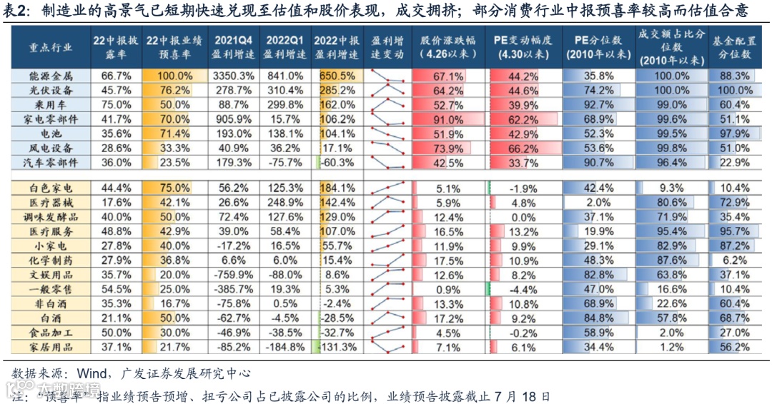 从下表2可视,表格上半部分,汽车及光伏产业链的代表行业无论从中报预喜率、还是中报已披露公司的盈利增速,大多都占据行业比较优势;但瑕疵在于短期股价涨幅40%-90%,估值上涨幅度、拥挤程度较高;