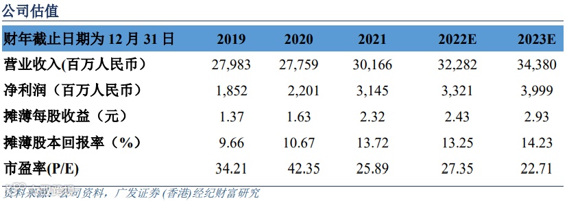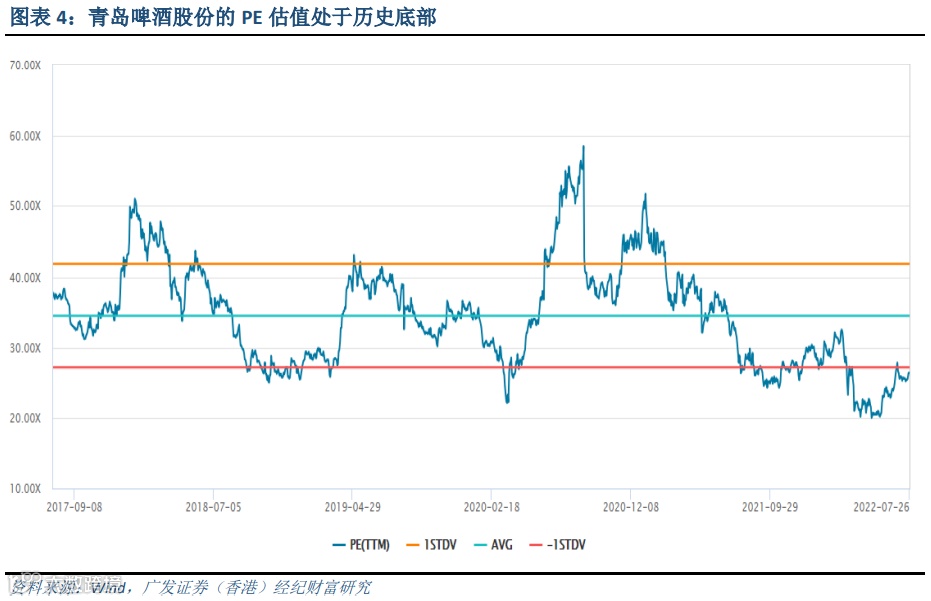 公司是国产啤酒的龙头企业,短期将受益于疫后复苏、炎热天气和去年低基数,预计三季度业绩将表现良好。中长期来看,我们继续看好啤酒行业竞争格局和公司经营管理改善。随着啤酒行业集中度大幅提升,行业的竞争逐渐缓和,产品定价权向头部企业转移。公司作为国产啤酒高端化的佼佼者,高端国货的影响力日渐加深,未来可继续通过产品结构升级来提升自身盈利能力。公司于 2020 年 3 月落地股权激励方案,考核重点转向盈利能力,公司的经营效率有望持续提升。预计公司 2022、2023 财年的净利润为 33.21和 39.99 亿元人民币,同比增速分别为 5.59%和 20.42%,目前股价对应 2022 财年的预测PE 为 27.35 倍,处于五年以来的估值底部。我们看好公司高端化进程和关厂提效带来的盈利能力提升,给予 34.5 倍历史市盈率均值,公司合理价格为 97.49 港元,建议关注。