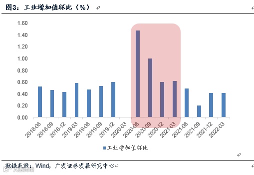 工业增加值环比在2019年均值为0.55%,2018-2019年为0.52%,2017-2019年为0.53%。简单来说,在经济正常周期中,工业的环比基本上在0.52-0.55%之间。疫情之后,2020年2月谷底位置为-22.1%,3月36.6%。防控常态化时段的2020年二季度至四季度均值分别为1.5%、1.0%、0.6%;2021年一季度为0.62%;2021年二季度至四季度分别为0.49%、0.21%、0.41%。