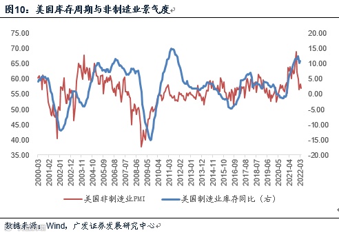 我们再观察美国制造业库存同比,其本轮库存在2020年9月触底,2022年1月触顶。目前处于高位回落初段。从经验来看,后面可能会有6-8个季度的时间处于去库存的时段。从经验规律看,美国制造业库存周期与其制造业、非制造业景气度均保持着相对稳定的相关性。