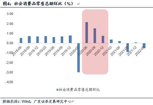 社会消费品零售总额环比在2019年均值为0.69%,2018-2019年为0.67%,2017-2019年为0.71%。简单来说,在经济正常周期中,消费的环比基本在0.67-0.71%之间。疫情之后,2020年1月谷底位置为-10.8%。防控常态化时段的2020年二季度至四季度均值分别为2.2%、1.5%、0.74%;2021年一季度为0.36%;2021年二季度至四季度分别为0.21%、-0.91%、0.08%。