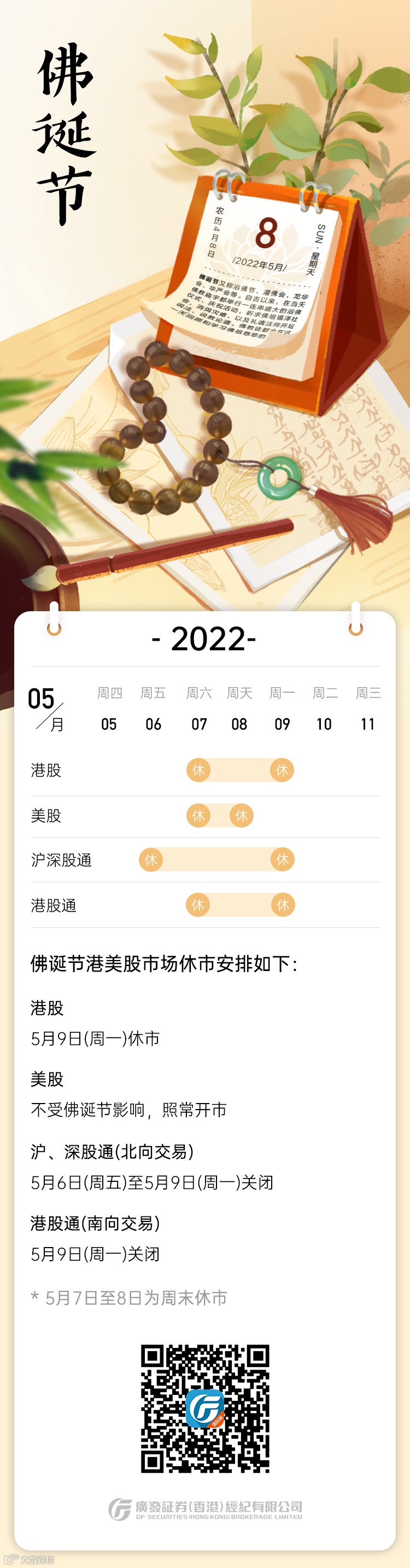 佛诞, 即佛的诞辰。相传释迦摩尼在农历四月八日诞生,故称此日为佛诞。值此节日,广发证券(香港)祝大家佛诞节快乐!