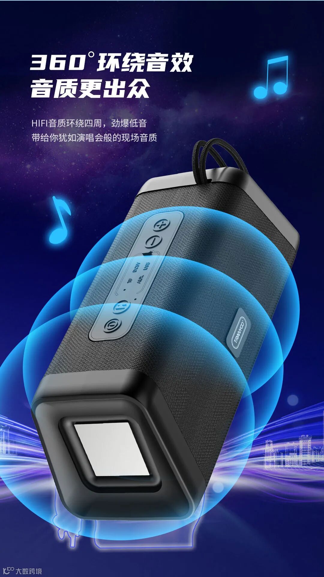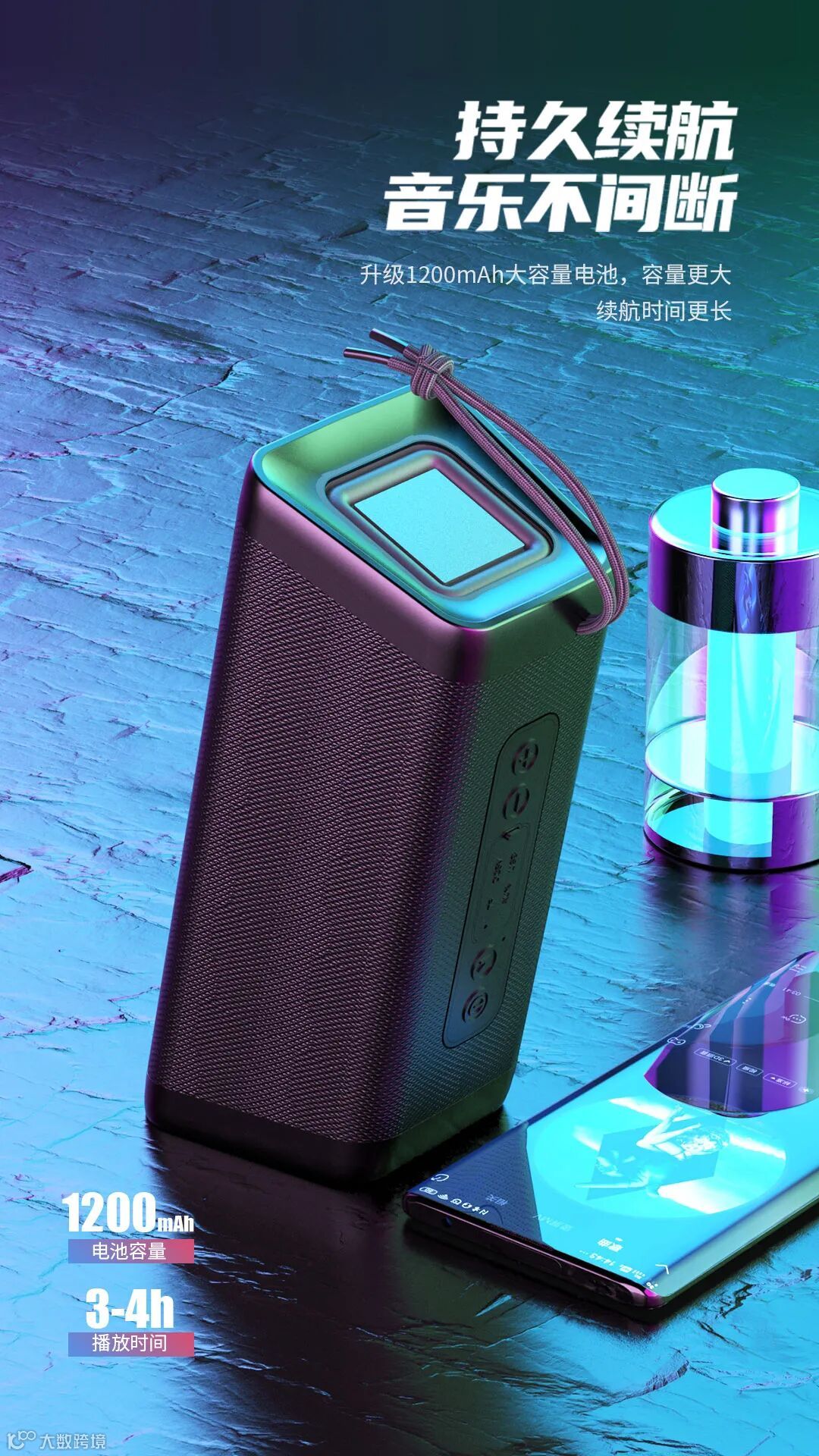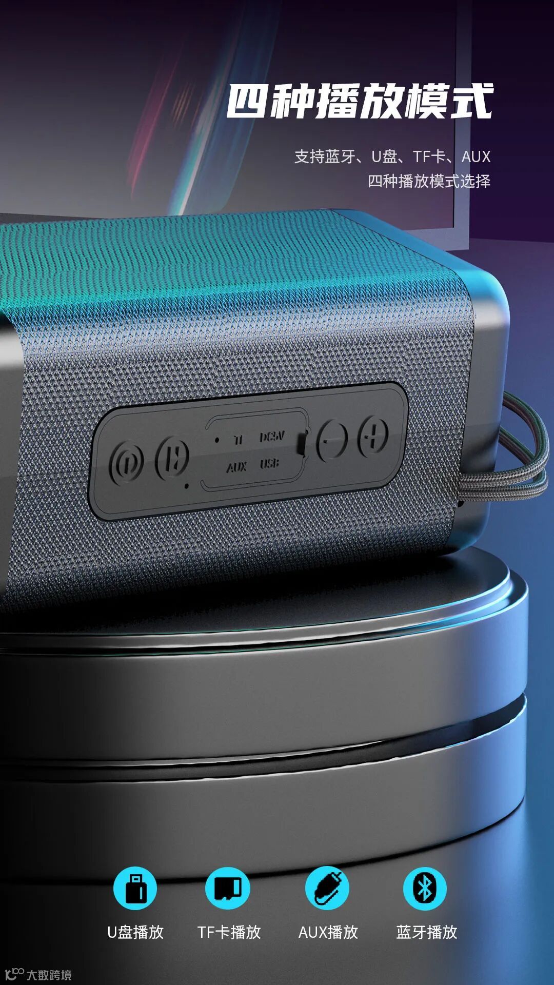 1.全频喇叭,双声道。2.超长播放时间连续听歌8小时3.支持音频AUX,TF卡,优盘,蓝牙四种播放模式。