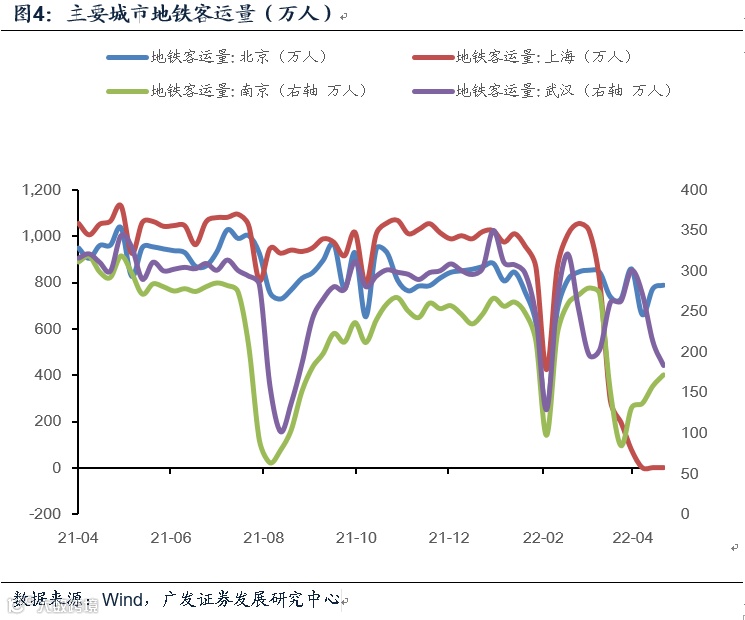 4月全国主要城市地铁客运量回落明显。截止4月28日,北京、上海、广州月均值数据相较3月分别下行3.8%、99.9%、21.2%;十大城市地铁客运量月均值相较去年同期回落45.5%。同样受社交距离上升和居民生活半径缩短影响,截至4月28日,4月电影票房月均值较去年同期回落79%。