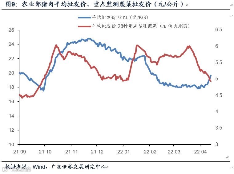 第十,猪肉价格触底反弹。4月农业部猪肉平均批发价录得19.8元/千克,较上月末环比回升8.5%。4月农业部重点监测28种蔬菜平均批发价环比回落18.3%。小麦、粳稻等粮食价格涨跌互现。非食品项影子指标义乌小商品指数环比持平。
