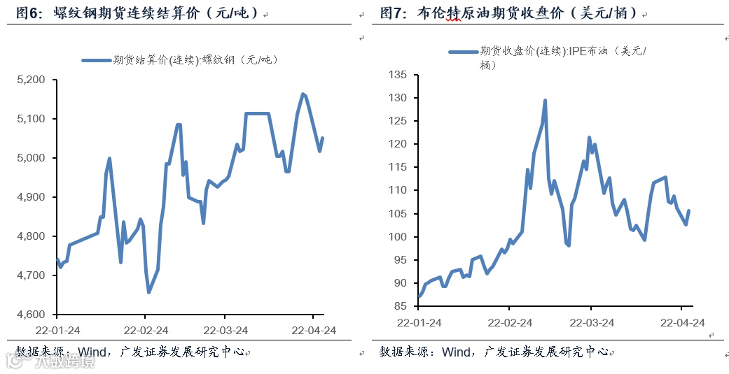 上下游行业开工率表现不一。Wind数据显示:4月第四周全国高炉开工率录得79.8%,相较3月末环比回升1.6pct,相较去年同期回落0.3%,主产区独立轧钢厂复产再检修比例增加,需求端受疫情及运输受阻影响,整体备货及采购情绪不佳;焦化企业开工率录得76.0%,相较去年同期回升9.0pct。PVC华东下游开工率持平,由3月最后一周的63%升至本月第四周的64%,同环比分别录得-9.0pct、1.0pct;山东地炼开工率维持弱势,读数由3月最后一周的53%回落至本月第四周的52%,相较3月环比回落1.4pct,较去年同期下行17.4pct。苯乙烯开工率录得75.0%,较3月末环比回落0.3pct。值得注意的是PTA江浙织机负荷率回落至历史次低的54.3%,相较3月环比回落7.3pct,较去年同期下行10.7pct。化工链下游开工负荷相对偏低,系疫情影响下终端需求偏弱,产业链利润维持在偏低水平,低加工费下多数装置检修增多所致。4月前四周,汽车半钢胎开工率分别录得67.1%、68.4%、67.4%、65.8%,最后一周读数处于季节性次低点(仅高于2020年4月52.6%),同环比分别录得-5.1pct、-8.8pct。4月前四周,全钢胎开工率分别录得49.4%、56.7%、59.1%、55.0%,3月最后一周读数59.2%,4月读数亦低于历史同期数据的59.7%-74.6%。