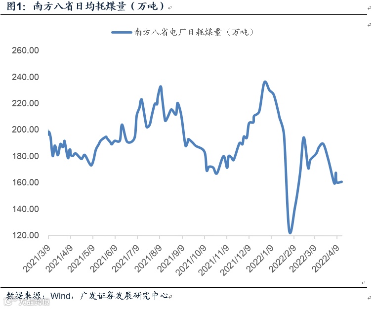 据鄂尔多斯煤炭网数据,4月发电耗煤数据在3月28日176.8万吨的基础上中枢回落。4月5日、4月7日、4月8日、4月15日、4月21日南方八省发电耗煤分别为159.4、167.5、160.4、160.6、157.4万吨,前21日数据大致相当于3月全月均值182.4万吨的88%,相当于去年同期均值183.0万吨的88%。据中电联《电力行业燃料统计日报》监测,4月1-7日纳入统计的燃煤发电企业日均发电量环比(3月25-31日)减少7.7%,同比减少18.6%;4月8日至4月14日环比(4月1日至4月7日)减少0.6%,同比减少19.3%。目前居民用电进入季节性淡季,国内疫情反复影响下,下游工业耗煤需求亦相对偏弱,贸易商及终端采购较为谨慎。