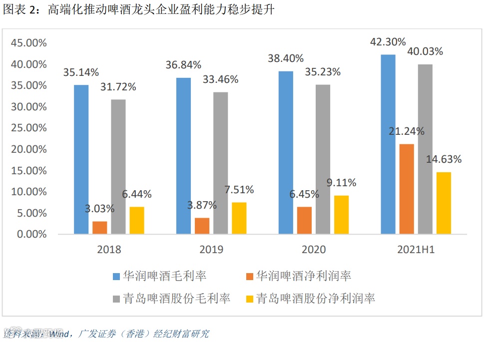 啤酒行业复苏情况良好,产品结构升级持续2021年啤酒产量为3562万千升,同比增长5.6%,行业需求回暖,行业集中度进一步向龙头酒企集中。在疫情多点散发和原材料大幅上涨等因素的影响下,2021年啤酒行业产品结构升级持续,其中高端产品维持高速增长,推动了毛利率和净利润率的提升。2021年百威亚太旗下百威品牌销量取得双位数增长,其中百威金尊销量同比增长超50%;科罗娜、福佳、蓝妹等超高端品牌销量也取得双位数增长,其中福佳果味系列销量翻倍。2021H1青岛啤酒旗下高端产品销量同比增长41.4%,远高于8.2%的总销量增长,吨酒价同比提升7.78%至3835元/吨;华润啤酒次高端及以上产品销量同比增长50.9%,高于4.9%的总销量增长,吨酒价同比增长7.5%到3098元/吨。