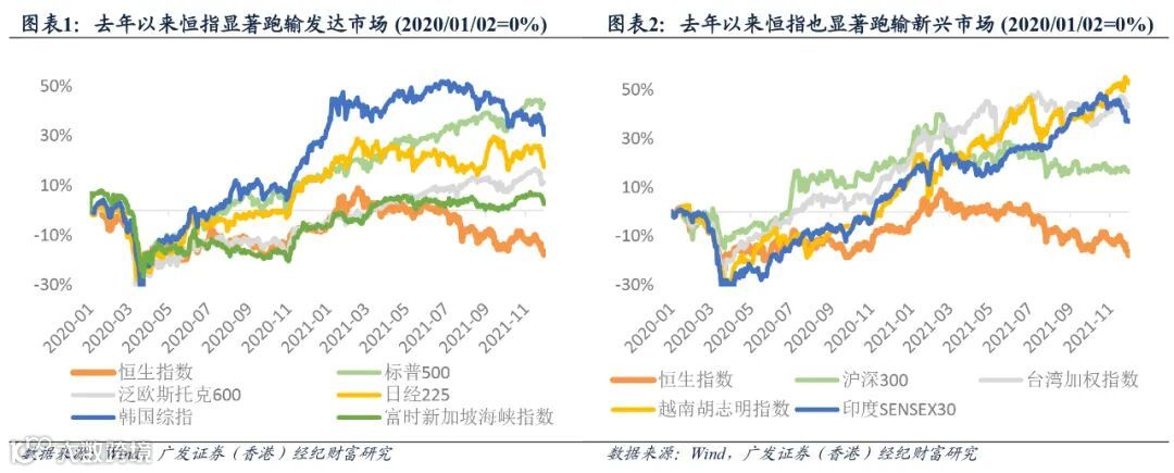(3)总的来看,新毒株带来的不确定性使得全球股市再次进入一个高波动的区间。港股作为典型的离岸市场,即使基本面没有遭遇非常严重的冲击,但应对波动和风险的能力却也相当薄弱:如11月30日的盘中,莫德纳CEO称现有疫苗对毒株的有效性或大幅下降,外围股指和期指跳水逾1%,而恒指在前期调整已较为充分的基础上仍一度跌近3%,再次领跌全球主要市场。事实上,在过去数次全球因系统性风险而产生的联动调整之中,港股经常沦为“提款机”的角色,具体表现就是“跟跌不跟涨”——跌幅甚至超过受影响更大地区的股市,而在此后的反弹浪潮之中则往往缺乏动能。