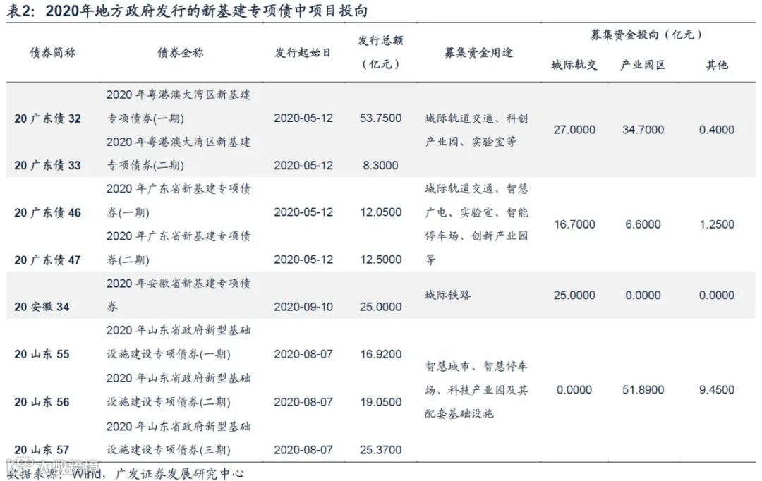 2020年发行的地方政府专项债中,在债券名称中明确为新基建专项债的有广东省新基建专项债券(一期和二期)、粤港澳大湾区新基建专项债券(一期和二期)、安徽省新基建专项债券、山东省政府新型基础设施建设专项债券(一期至三期),发行规模共173亿元。