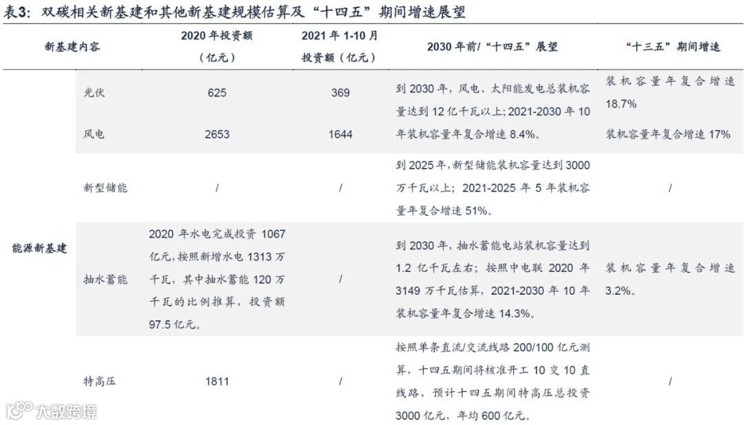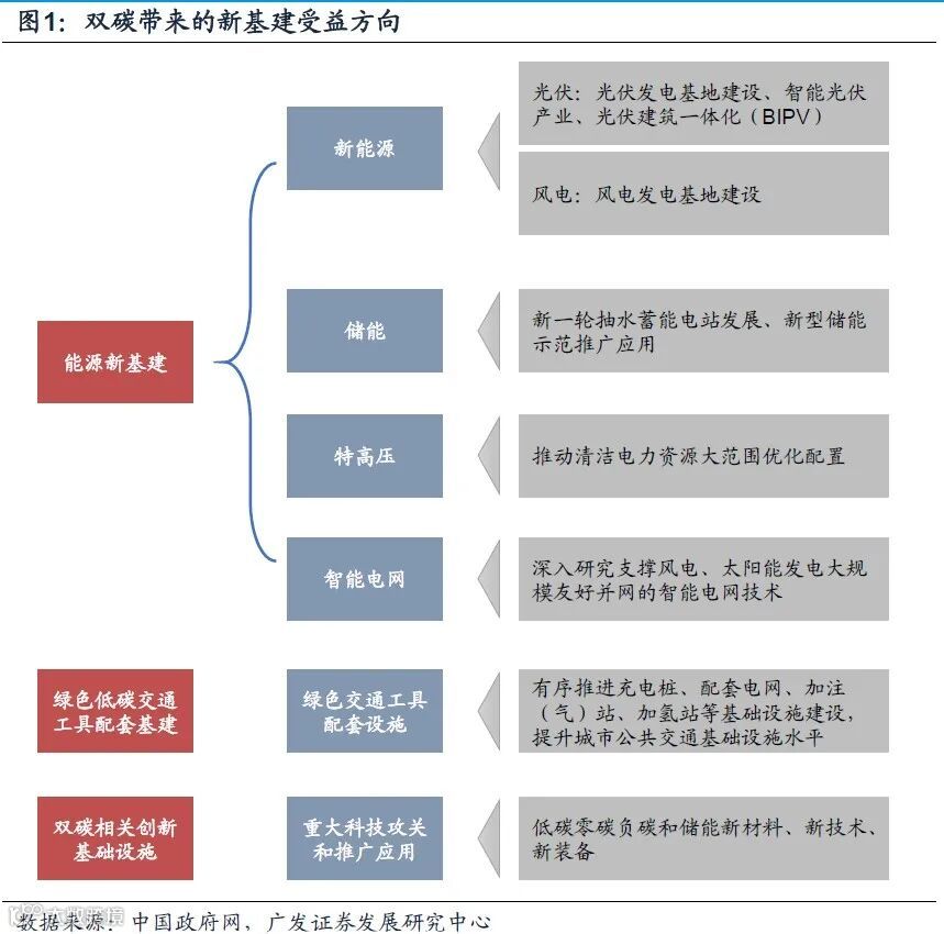 第三是双碳相关创新基础设施建设,根据前面提到的2020年4月份发改委给出的新基建主要内容之一是“创新基础设施”,即支持创新和科学研究的基础设施。而双碳顶层设计文件的一大重点是“绿色低碳重大科技攻关和推广应用”,包括低碳零碳负碳和储能新材料、新技术、新装备,支撑风电、太阳能发电大规模友好并网的智能电网技术,规模化碳捕集利用与封存技术研发、示范和产业化应用等等。
