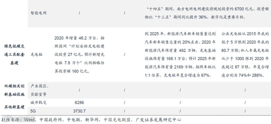 第五,按照我们理解,双碳将在三个方面对“新基建”外延存在拓展:(1)能源新基建,包括新能源发电(光伏、风电、BIPV)、新型储能和抽水蓄能、特高压和智能电网;(2)清洁低碳交通工具配套基础设施,典型如充电桩、加注(气)站、加氢站等;(3)双碳相关创新基础设施建设,如低碳零碳负碳和储能新材料、新技术、新装备等相关国家重点实验室、国家技术创新中心、重大科技创新平台等。