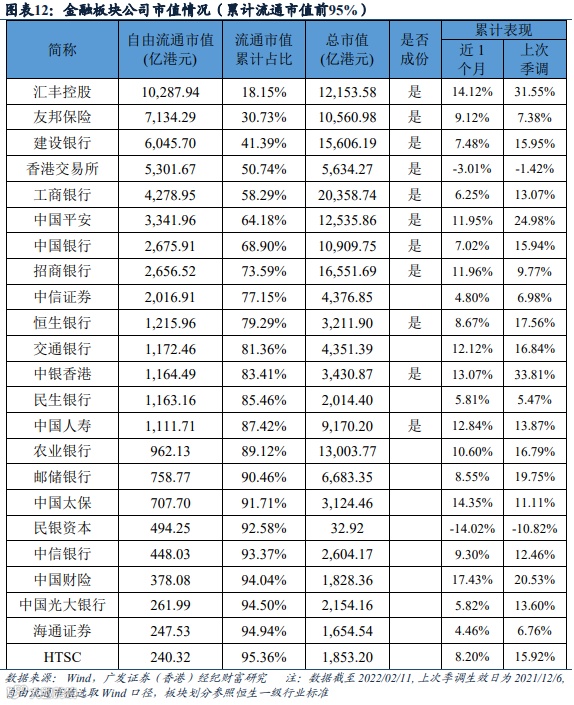该组别的市值覆盖率近八成,已经基本囊括了香港与大陆最重要的银行和保险等金融机构,后续整体将维持稳定的态势,看点在于可能增加大陆非银机构的比重。