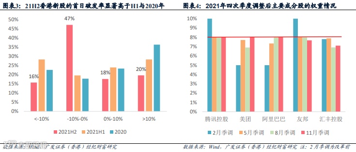 (2)进度:时限放宽之后,暂未有公司享受到这一改革的红利。这其中的考量似乎也不难理解:一般而言,首发上市的新股需要一定的时间以供市场形成定价的共识,也使投资逻辑完成由一级市场向二级市场的转变(此前部分行业甚至出现一二级市场定价“倒挂”的局面,去年H2港股的破发率也大幅提升)。在共识未完全形成之前,新股的波动中枢都将处于较高水平。以恒生科技指数为例,其快速纳入的机制在某种程度上成了一把“双刃剑”——虽然保证了对于中国创新科技企业的及时覆盖,但客观上指数的整体波动也被放大。因此,虽然纳入新成分股的时间要求被大幅缩短,但在具体执行层面恒指公司或仍将保持较为审慎的态度。