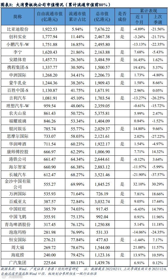 3. 必需/非必需消费业组别:新能源车的景气度处于上行状态,后续可能在指数中占据更重要的位置;屡次“大热倒灶”的农夫山泉仍是最具跻身蓝筹潜力的成分股;携程集团和百胜中国则有望为恒指中的二次上市企业“添砖加瓦”。