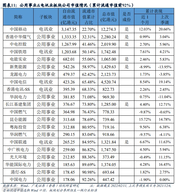 6. 公用事业&电讯业组别:公用事业板块仍有覆盖率提升的空间,后续清洁能源占比高的发电企业和技术领先的环保企业或将入围,如龙源电力、华润电力等。
