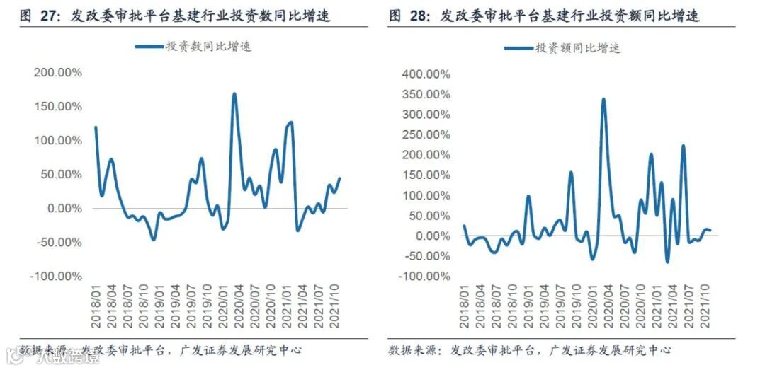 此外还需要注意的两点,基建投资同时还需要其他政策的配合,如货币政策、债务监管政策;且目前发改委审批平台的基建项目数量同比增速虽明显上升,但项目规模增速还在低位徘徊,而往年在提前批额度下达前夕,地方向发改委申报的项目规模增速往往会出现显著上行趋势。