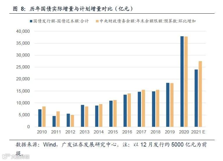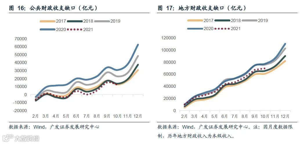 因此重要财政参数在中性情形下预计将维持今年的基础或小幅上涨。小幅上涨主要原因一是今年无论狭义财政或广义财政,均仍有一定的余量资金可供用于明年初,且这一资金规模较往年略高,故大幅扩张的必要性不高;二是地方举债空间仍然受到债务率指标掣肘,2017-2020年的地方债务率分别为77%、77%、83%、91%,而国际公认债务比率的安全标准是小于100%,可见去年地方债务率已接近警戒区间下限,而今年年底这一比率大概将达到100%以上。