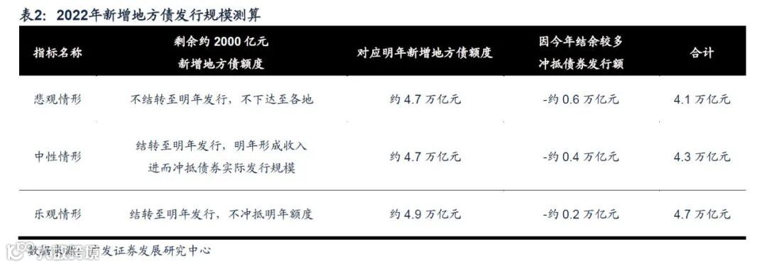 在大部分年份中,表1提到的中央赤字规模与全年国债净融资规模基本一致,而地方赤字规模与全国新增一般债的发行规模基本一致,即在正常情况下,2022年的国债净融资规模大概率将约等于3万亿元左右,而新增一般债发行规模大概率将约等于1万亿元左右。