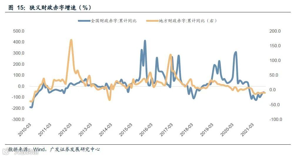图15可知目前无论全国财政抑或地方财政,其狭义财政赤字累计增速均位于历史较低水平,未出现明显上行趋势,收支缺口压力较小[8]。