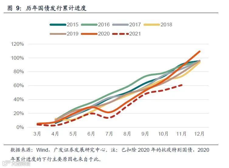 2021年专项债发债节奏后置是最受瞩目的一大财政特征,1-11月发行进度仅为91%,往年前三季度基本能够发行完毕。专项债的后置导致基建项目的后置,进而导致与专项债无直接联系的狭义财政基建分项也出现了偏弱与后置的特征,狭义财政支出中的基建分项也相对偏弱。而在专项债之外,今年一般债和国债发行进度也都明显偏慢。