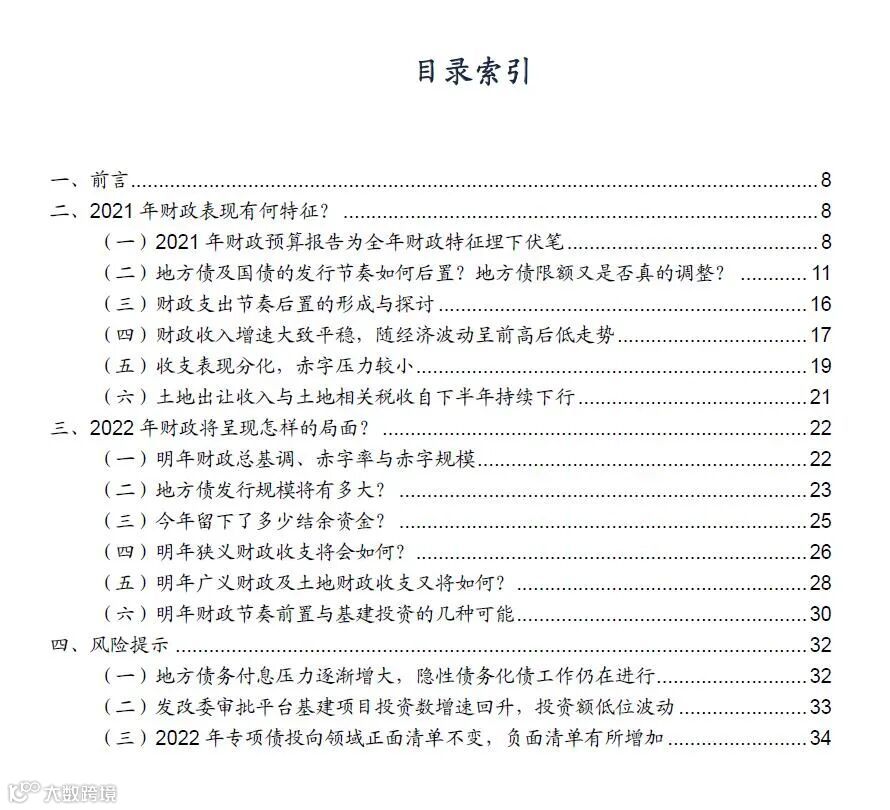 第四,值得注意的是,财政领域所呈现出来的特征,本质上取决于前期的宏观政策和财政政策框架,实际上上述几大特征在去年下半年或今年年初的政策线索中已有预兆,例如全年土地财政收入目标增速为0%、专项债穿透式监管自2020年年中起就已被反复强调、中央经济工作会议提出财政政策要“更可持续”,以及“抓实化解地方政府隐性债务风险工作”、国常会提出“政府杠杆率要有所降低”等。同样,对于理解2022年的财政特征,我们要深入理解今年底的宏观经济政策和财政政策定调。