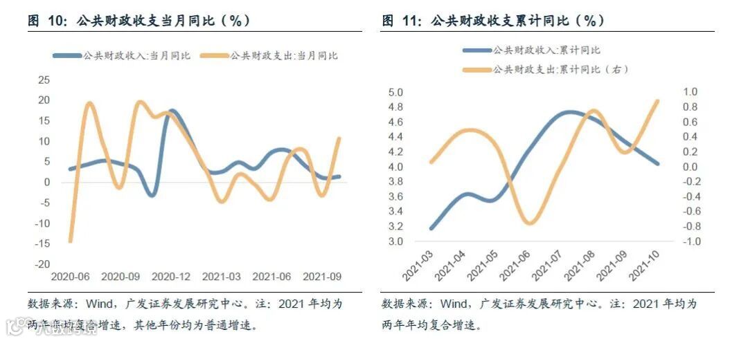 对于公共财政收入,一般公共预算当月同比从3月的最高点42.4%逐月下行至10月的-0.1%,主要受到去年经济前低后高的错位影响。扣除基数因素后的两年年均复合增速则在7月达到最高点后开始显著下行,与下半年以来的经济景气度降温有关。