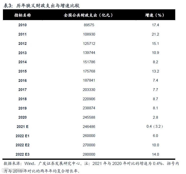 狭广义综合来看,我们预计2022年一般公共预算(狭义财政)收入约在22-24万亿元左右,而狭义赤字规模约在4万亿元左右,赤字规模较今年提升约4300亿元,对应支出约在26万亿元至28万亿元左右,同比多增1万亿元-3万亿元。