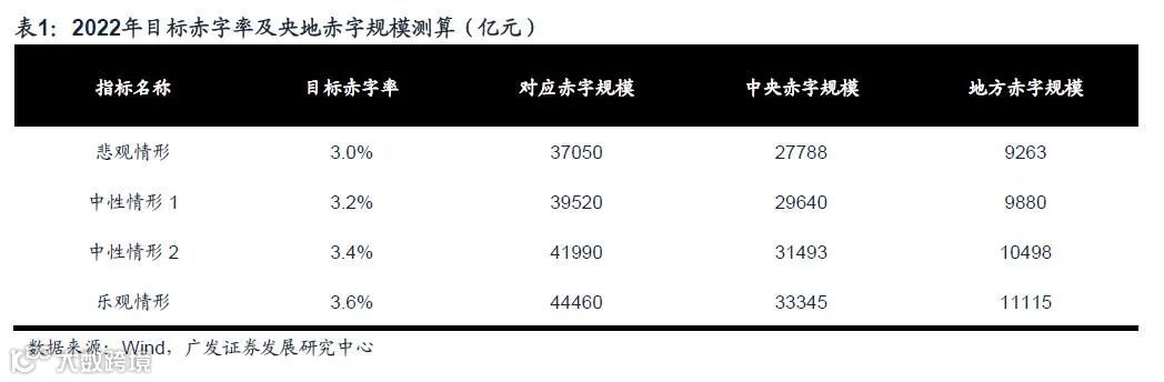 因此中性情形下我们认为2022年目标赤字率大概率将位于3.2%-3.4%,对应目标赤字规模在4万亿元左右,其中中央赤字规模3万亿元左右,环比今年多增2500亿元左右,地方赤字规模1万亿元左右,环比今年多增2000亿元左右。乐观情形与悲观情形的测算见正文表1。2022年新增专项债额度3.7万亿元,环比今年增加1000亿元左右。两项合计环比增量约为5500亿元。