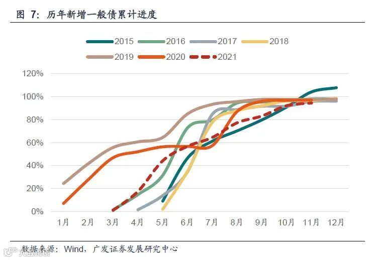 第二,2021年财政的特征之二是节奏上整体“后置”。上半年财政纪律的整肃和专项债的穿透式监管可能是关键背景之一,隐性债务化解是另一个重要背景。一般来说,在经济压力不大的时段更适宜推进改革化解风险,未雨绸缪。除专项债外,今年地方新增一般债与中央国债也都存在不同程度的后置现象。财政后置一则导致相对于外需来说,建筑产业链影响的内需在下半年逐步放缓;二则导致信用派生偏弱,银行间狭义流动性相对宽松。