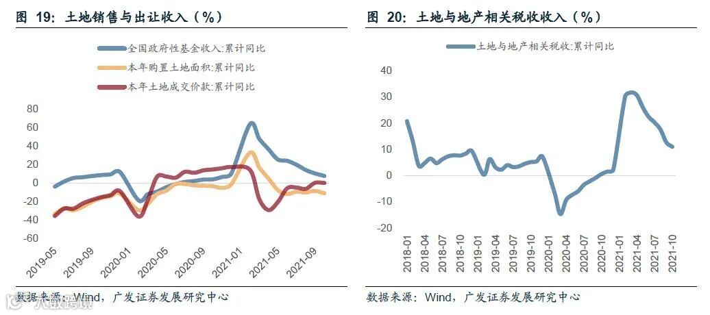第三,2021年财政的特征之三是土地市场的压力逐渐上升。2021年下半年土地市场与地产销售不复去年以来的高景气度,各地流拍频现,这一点也反映在土地出让收入和狭义财政中的土地地产税收方面。土地出让金是财政第二本账的主要组成部分(见我们前期报告《土地出让金与短周期经济增长》),对经济端有广泛传递链条。财政和就业的潜在压力是稳增长的重要背景。土地出让金自下半年起随着地产销售的下滑而显著下降,累计同比由上半年的22.4%降至前10个月的6.1%,其中7-10月的合并同比增速只有-10.4%。同时,狭义财政中与土地相关的税收收入也应声下行,五项税收收入累计同比自上半年的22.3%逐月下行至1-10月的10.9%。