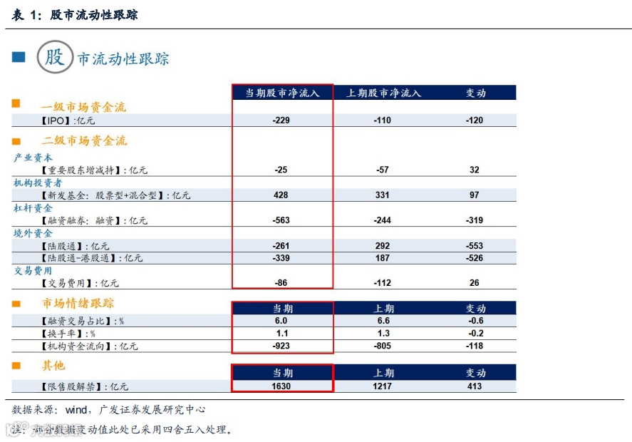 二级市场:上周两融融资规模下降,A股二级市场呈现资金净流出。流入方面,南下资金流入78亿元,国内基金(股票+混合)新发行428亿元;流出方面,北上资金流出261亿元,两融融资减少563亿元,重要股东减持25亿元,交易费用86亿元。