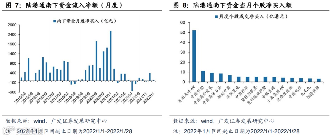 (6)陆港通南下资金流入净额:上周港股通南下资金净流入78亿元,前一周净流入105亿元。截止2022年1月28日,2022年1月南下资金净流入358亿元。上周净买入个股前五为美团点评-W、中国移动、中国海外发展、中国海洋石油、融创中国。