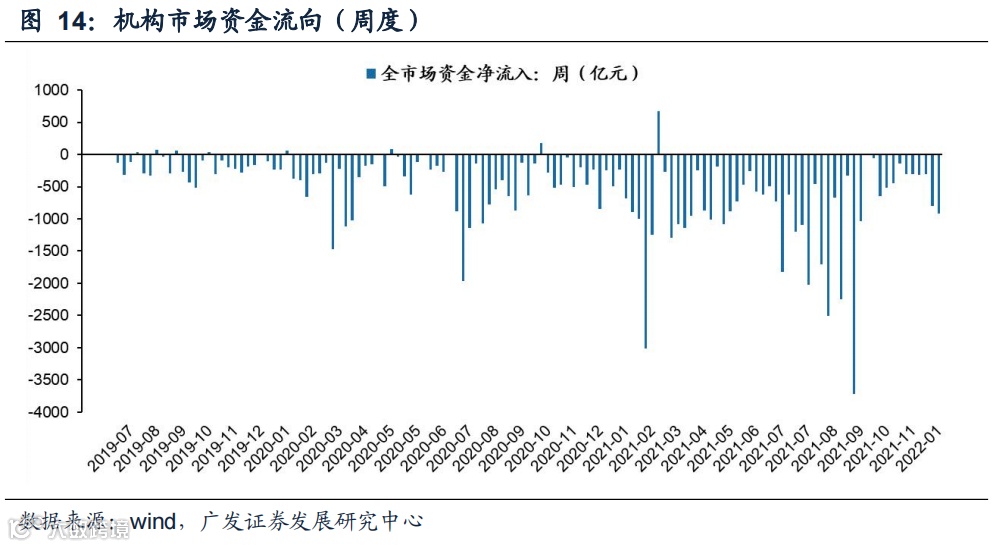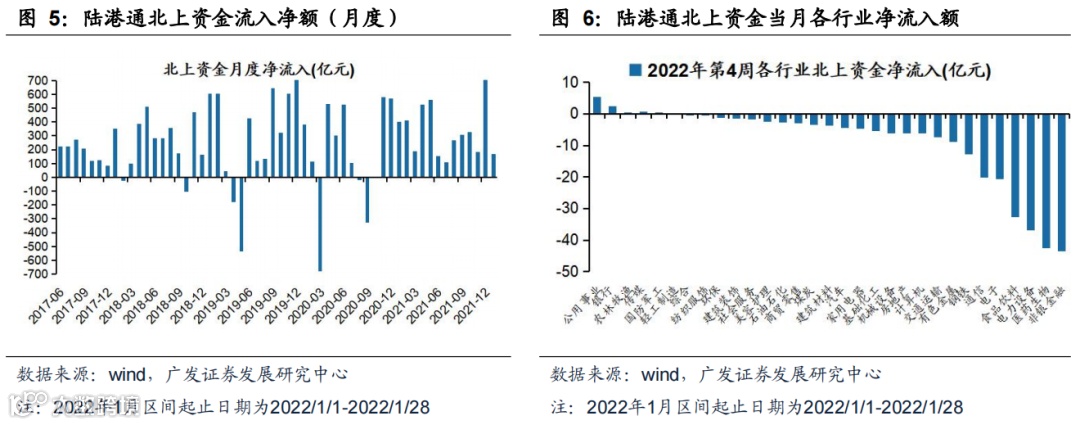 (5)陆港通北上资金流入净额:上周陆股通北上资金净流出261亿元,前一周净流入292亿元。截至2022年1月28日,2022年1月北上资金净流入168亿元。上周净流入行业前五名是公用事业、银行、农林牧渔、传媒、国防军工,净流出行业前五名是非银金融、医药生物、电力设备、食品饮料、电子。