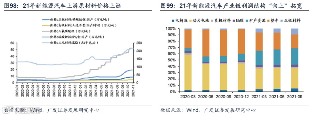 新能源汽车产业链“镜像”:21年供需缺口引致原材料(六氟磷酸锂、碳酸锂等)涨价传导带动上游利润拓宽(如锂矿、电解液、正极材料),中下游承压。22年随上游成本端价格趋稳,预计中下游制造(整车、零部件-轻量化、热管理、动力电池等)业绩修复确定性较大。