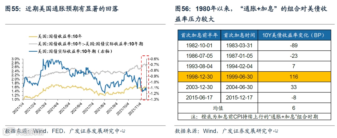 2. 后高:当前市场预计22年美联储或将加息2次,美债面临“通胀+加息”组合。历史上,历次美联储首次加息前6个月对美债利率冲击有限;但“通胀+加息”的组合对美债收益率压力则较大。1980年以来,在可比的“通胀+加息”组合下,美债利率上行了116BP。