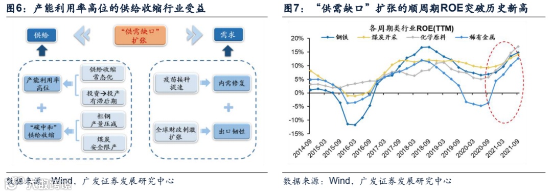 “供需缺口”扩张的顺周期形成21年第一个显著的贝塔:21年顺周期行业由“供需缺口”扩张支撑毛利率扩张,很多行业ROE超过上一轮16-17年供给侧改革高点,且业绩高弹性向股价形成映射。