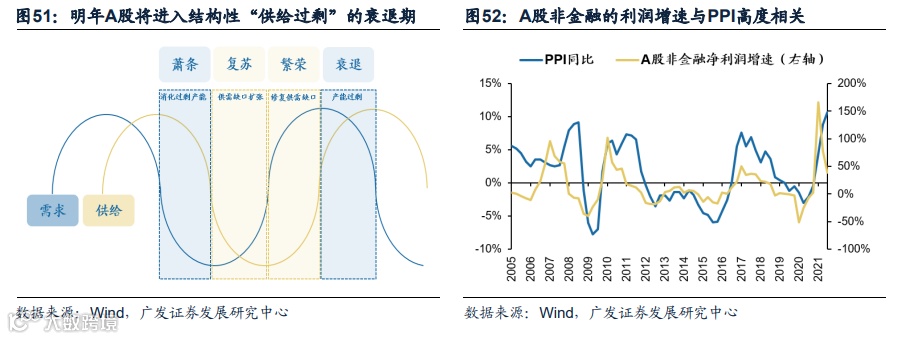 22年潜在“供给过剩”,A股进入“衰退期”,盈利进入“下行期”。我们在2.3《哪些行业“供需缺口”潜在扩张?》中提出了结合“需求-供给”判断企业产能周期潜在影响的判断。根据经典的“需求-供给”曲线,21年A股处于典型的“供需缺口”复苏期,预计22年A股将进入“供给过剩”的衰退期,而“衰退期”的典型特征就是“量升价跌”:结构性“供给过剩”导致PPI见顶回落。同时,历史上来看,A股盈利增速与PPI的相关性较高,预计2022年PPI同比将回落,A股盈利也将进入“下行期”。