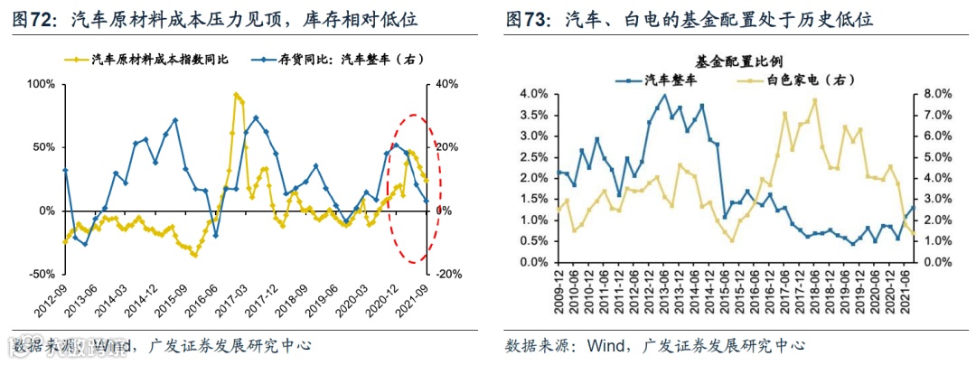 当前来看,汽车已呈现成本压力见顶、需求磨底迹象,基金配置亦处于低位。后续密切跟踪其成本传导及需求复苏情况带来配置修复。“缺芯”预期缓解及原材料价格回落之下,成本压力边际缓解。库存大幅去化,产销磨底。