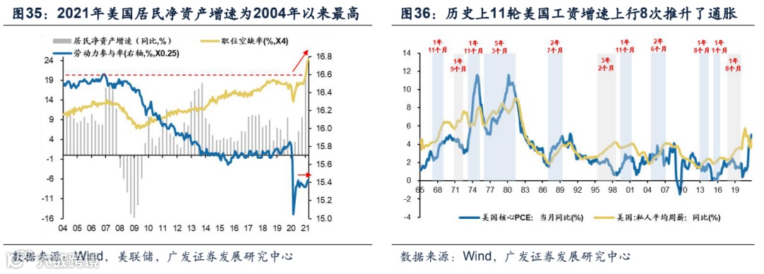 美国居民资产增值对就业意愿有挤出效应,劳动力市场的供需矛盾可能会导致“工资——通胀”螺旋。市场认为随着补贴退出,居民收入增速回落会带来美国劳动力市场明显修复,但我们观察到的是(1)美国职位空缺率处于历史高位(2)美国劳动参与率持续走平,且离职率上升。综合反映劳动力市场需求旺盛但居民就业意愿仍低。我们认为就业意愿较低的原因除了归结于疫情以及已经发放完毕的财政补贴以外,很重要的是美国居民部门资产增值速度处于2004年以来最高的水平,因此即使收入增速下降,资产增值所带来的财富效应依然对就业意愿有挤出。