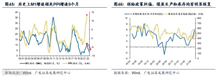 国内PPI增速预计已处于顶部区域,2022年整体或处于下降趋势中。从需求端来看,由于M1反映企事业单位可立即使用的潜在“购买力”,因此M1增速下降则意味着对工业品的潜在需求减弱。历史上M1领先PPI增速9个月左右,本轮M1增速于2021年初触顶,对应本轮PPI增速的高点大约在4季度。从供给端来看,供给收缩政策的纠偏已取得一定效果。10月以来,随着 “保供稳价”政策的持续推进,供给收缩对于价格的影响在逐渐减轻,比如10月以来煤炭库存已有明显回升,上游采矿业的工业增加值增速也在显著回暖。